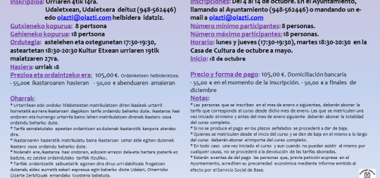 Inskripzioa: Urriaren 4tik 14ra. Udaletxean, Udaletxera deituz (948-562446) edo olazti@olazti.com helbidera idatziz. Gutxieneko kopurua: 8 pertsona Gehieneko kop...