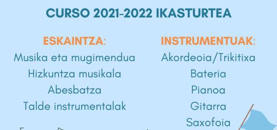 Olaztiko Udal Musika Eskolan izena emateko epe berezia ireki da abuztuaren 16tik irailaren 3ra arte. Honakoa da eskaintza: Musika eta Mugimendua (5 urte...