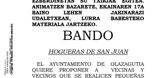 Olaztiko Udalak bizilagunei proposatu nahi die auzo eta kale ezberdinetan su txikiak egitea. Animatzen bazarete, ekainaren 17a baino lehen jakinarazi udaletxean, lurra bab...