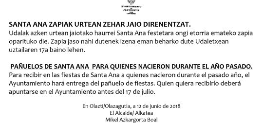 SANTA ANA ZAPIAK URTEAN ZEHAR JAIO DIRENENTZAT. Udalak azken urtean jaiotako haurrei Santa Ana festetara ongi teoría emateko zapia oparituko die. Zapia jaso nahi dutenek i...