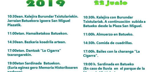 EKAINAK 22, LARUNBATA. EGITARAUA: 10:30ean. Kalejira Burundar Txistulariekin. Jarraian Batuekora igoera San Miguel Plazatik. 11:00etan. Hamaiketakoa Batuekon. ...