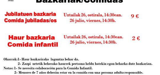 1-Jubilatuen bazkaria: Uztailak 26, ostirala, 14:30ean. Prezioa: 9€. 2- Haur bazkaria: Uztailak 26, ostirala, 14:30ean. Prezioa: 2€. Oharrak: 1- Haur bazkarira...