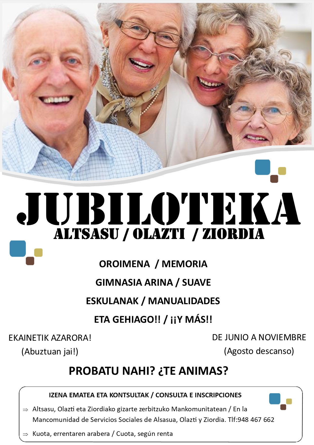 Altsasu, Olazti/Olazagutia eta Ziordiako oinarrizko gizarte zerbitzuen Mankomunitateak 65 urtetik gorakoei zerbitzu berri hau eskaintzen du. Xedea: zahartze aktiboa...