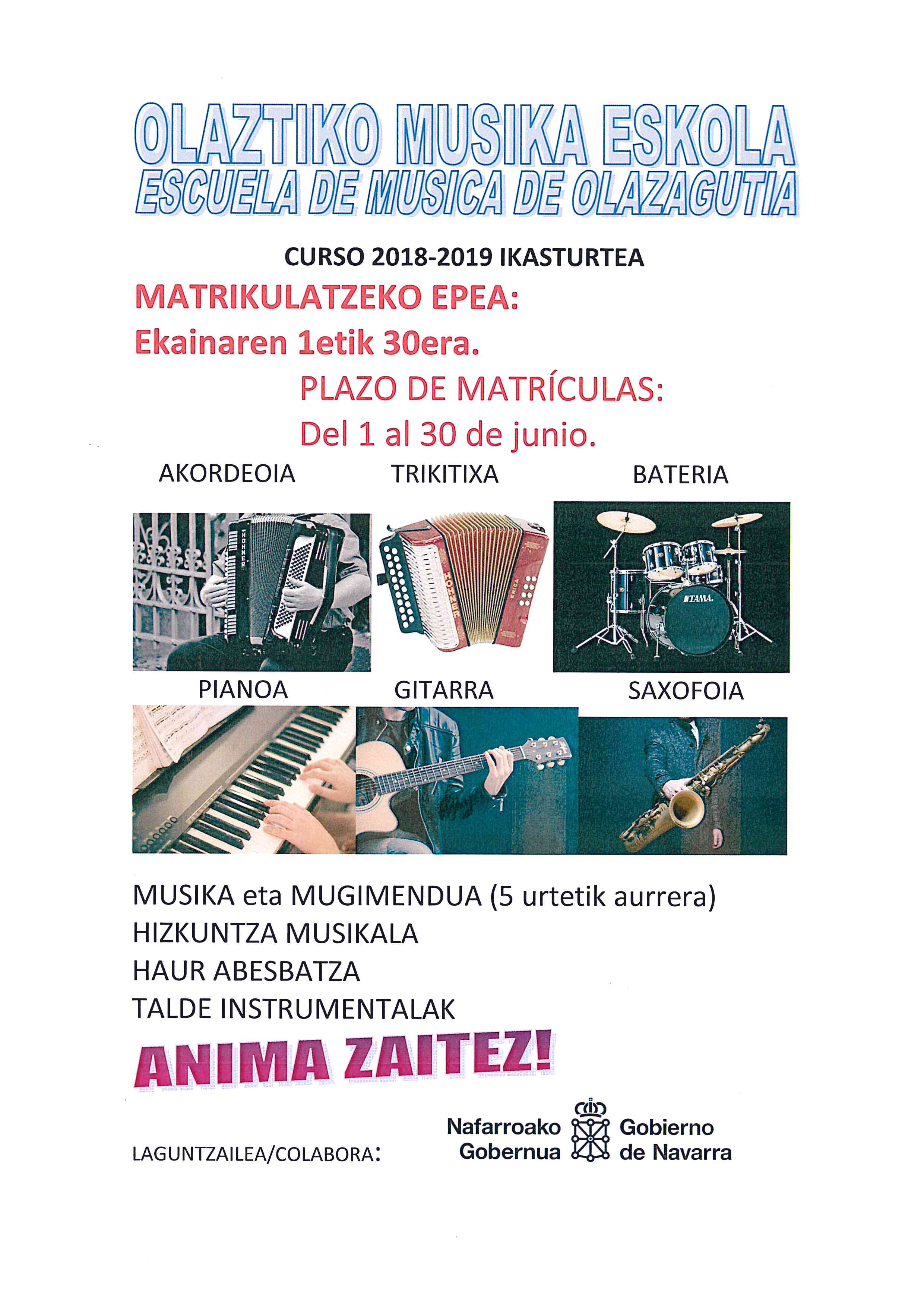 Olazti/Olazagutiako Udal Musika Eskolan izena emateko epea ireki da ekainaren 1etik 30era arte. Honakoa da eskaintza: Musika eta Mugimendua (5 urtetik aurrera) eta ...